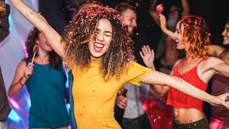 A woman dances joyfully at a lively Oktoberfest party, enjoying premium Oktoberfest luxury transport for a hassle-free experience.